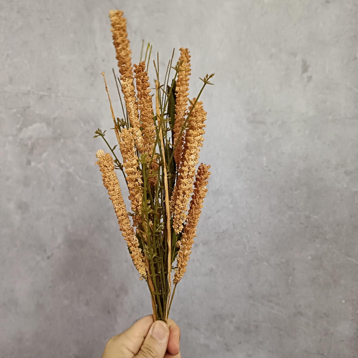O Buquê Complemento Outono 60cm é um arranjo decorativo que combina elegância e rusticidade. Ele é composto por hastes longas e finas, adornadas com folhas verdes e flores secas em tons de marrom e bege. As flores têm uma textura delicada e um formato que lembra espigas de trigo ou flores de capim, enquanto as folhas verdes alongadas adicionam um toque de frescor ao conjunto.