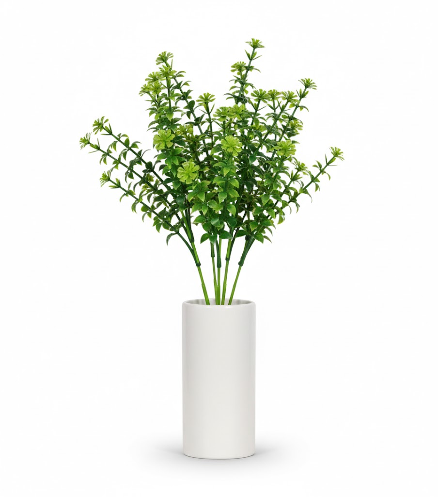 O Buquê de Folhas Sedum X5 34cm é uma folhagem artificial perfeita para composições modernas, leves e super naturais. Com 5 hastes e raminhos cheios de pequenas folhas, ele cria volume com delicadeza e um visual “verdinhos” muito elegante, ideal para vasos pequenos e médios, centros de mesa, cachepôs e arranjos permanentes.