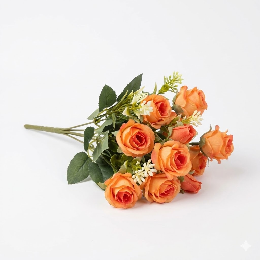 Se a ideia é trazer romantismo e um ponto de cor quentinho para o ambiente, este buquê de rosas artificiais laranja terracota é a escolha perfeita. São rosas cheias e bem formadas, em um tom laranja sofisticado, combinadas com folhagens e pequenos detalhes em verde que deixam o arranjo ainda mais harmonioso e acolhedor.