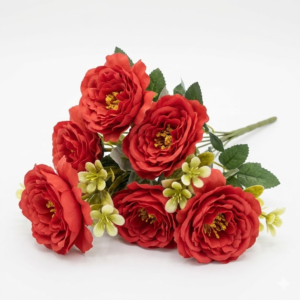 Se a ideia é trazer romantismo e um ponto de cor marcante para o ambiente, este buquê de peônia vermelha é a escolha certa. Com aproximadamente 34cm de altura e 6 flores cheias de pétalas, ele tem um vermelho intenso e elegante, que se destaca em qualquer cantinho da casa. As folhagens verdes e as florezinhas complementares deixam o arranjo mais volumoso e harmonioso.