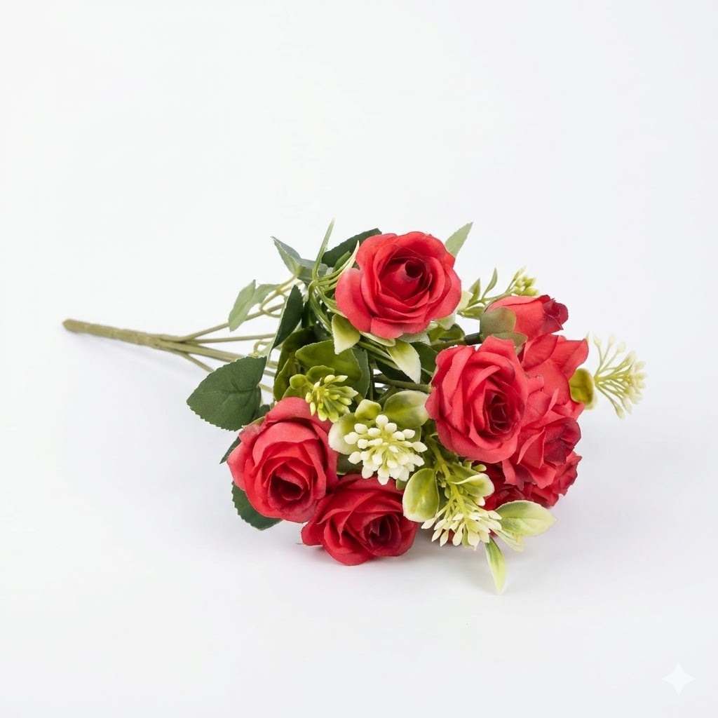 Se a ideia é trazer romantismo e um ponto de cor marcante para o ambiente, este buque de rosas vermelhas artificiais é a escolha perfeita. São rosas cheias e bem formadas, em um tom vermelho intenso, combinadas com folhagens e pequenos detalhes em verde que deixam o arranjo ainda mais harmonioso.