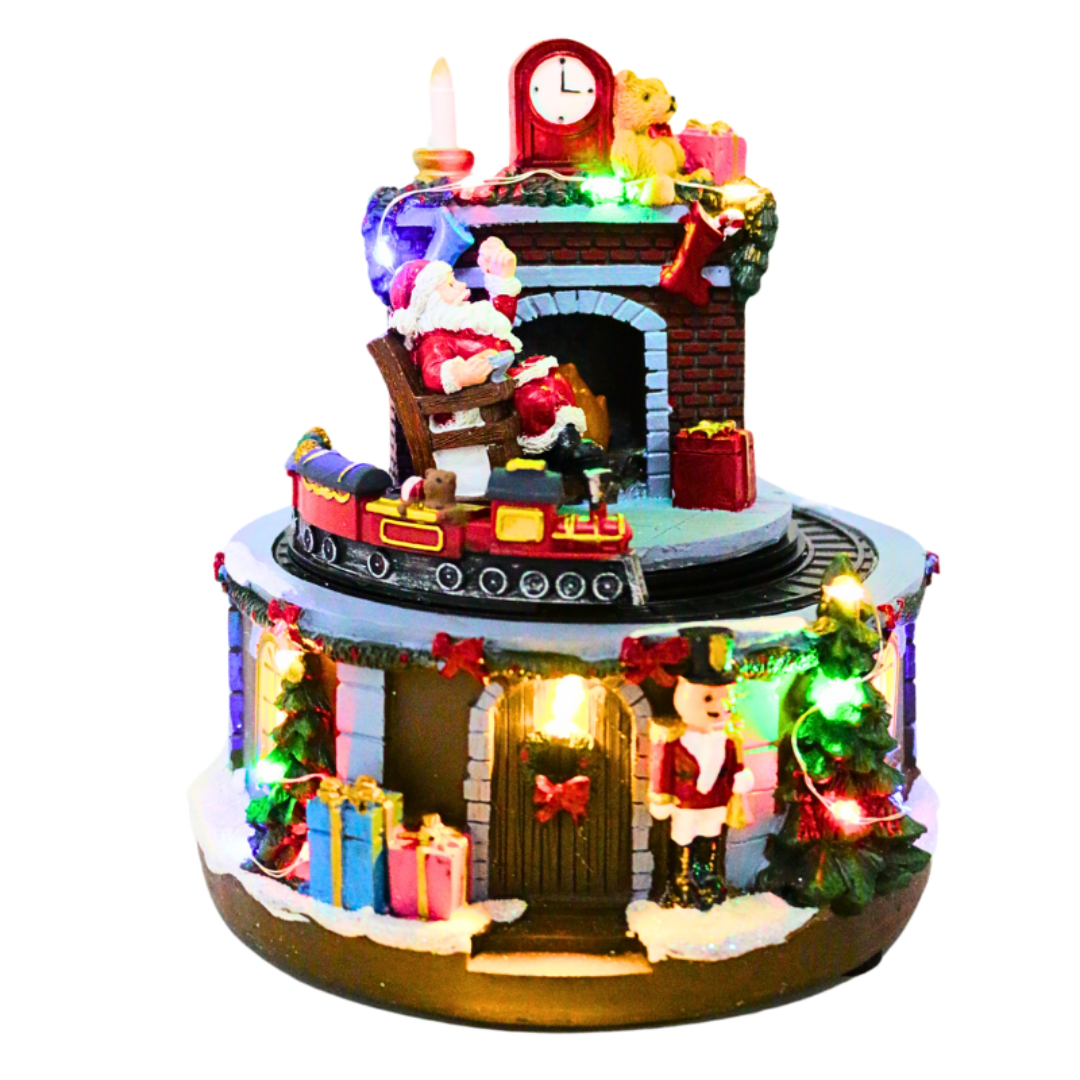 Com 17 cm de altura, o tamanho é ideal para aparadores, mesas laterais, balcões de atendimento e prateleiras. A animação dá vida ao cenário, enquanto a função musical reforça o clima festivo com melodias clássicas de Natal.