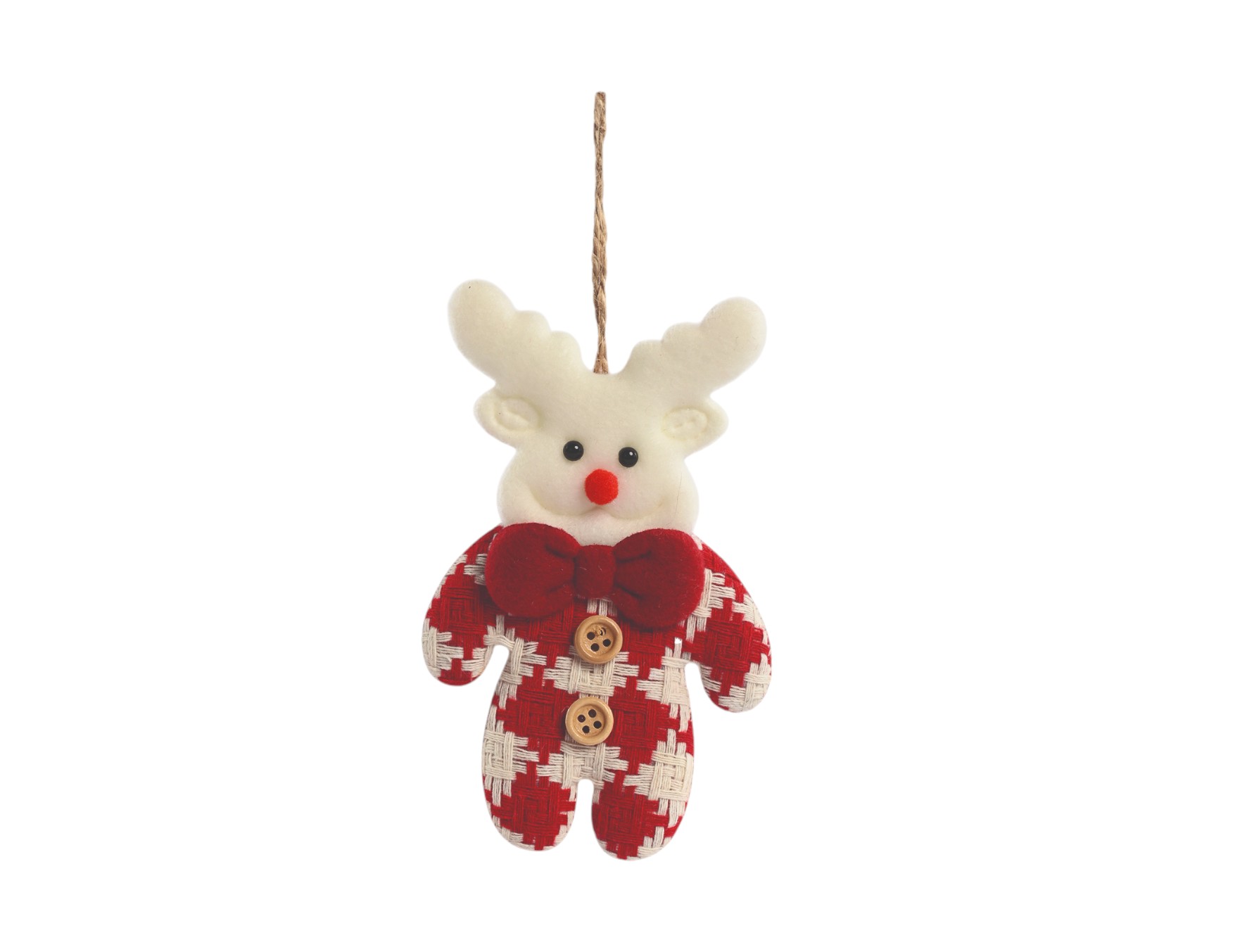 Este enfeite de Natal, medindo 8 x 14 cm, destaca uma charmosa rena. Ela tem um nariz vermelho brilhante, olhos pretos expressivos e está decorada com uma gravata borboleta dourada. A rena está fixada a um corpo em formato de estrela, que possui um padrão de diamantes pretos e dourados. Na base da estrela, há um pequeno sino dourado, acrescentando um toque de festividade ao ornamento. É perfeito para enfeitar sua árvore ou qualquer espaço natalino com um toque especial.