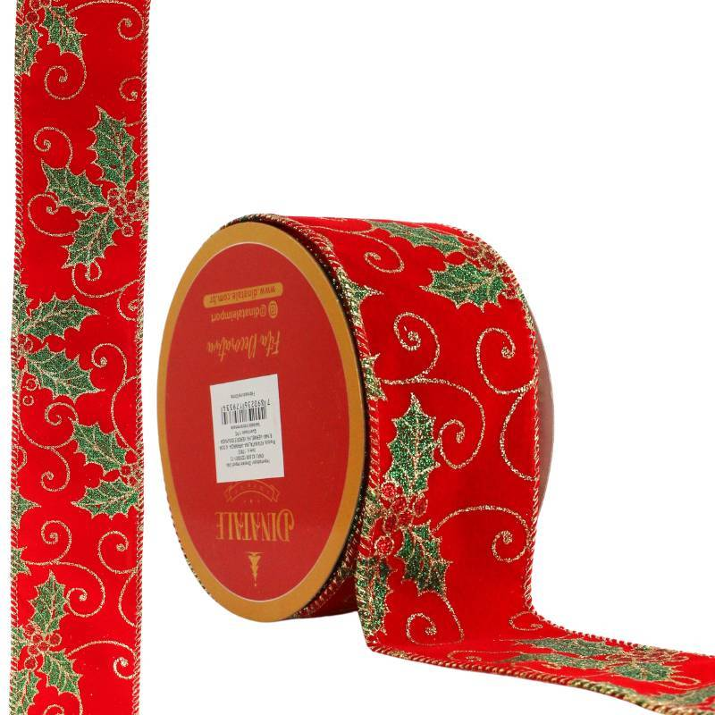 Clássica e impactante, esta fita combina o vermelho intenso com folhas de azevinho em verde e arabescos com brilho dourado. As bordas aramadas permitem modelar laços volumosos que mantêm a forma, valorizando guirlandas, árvores, arranjos e embalagens. O rolo de 9,14 metros rende diversos laços com padrão uniforme, ideal para quem busca acabamento profissional em decoração natalina.