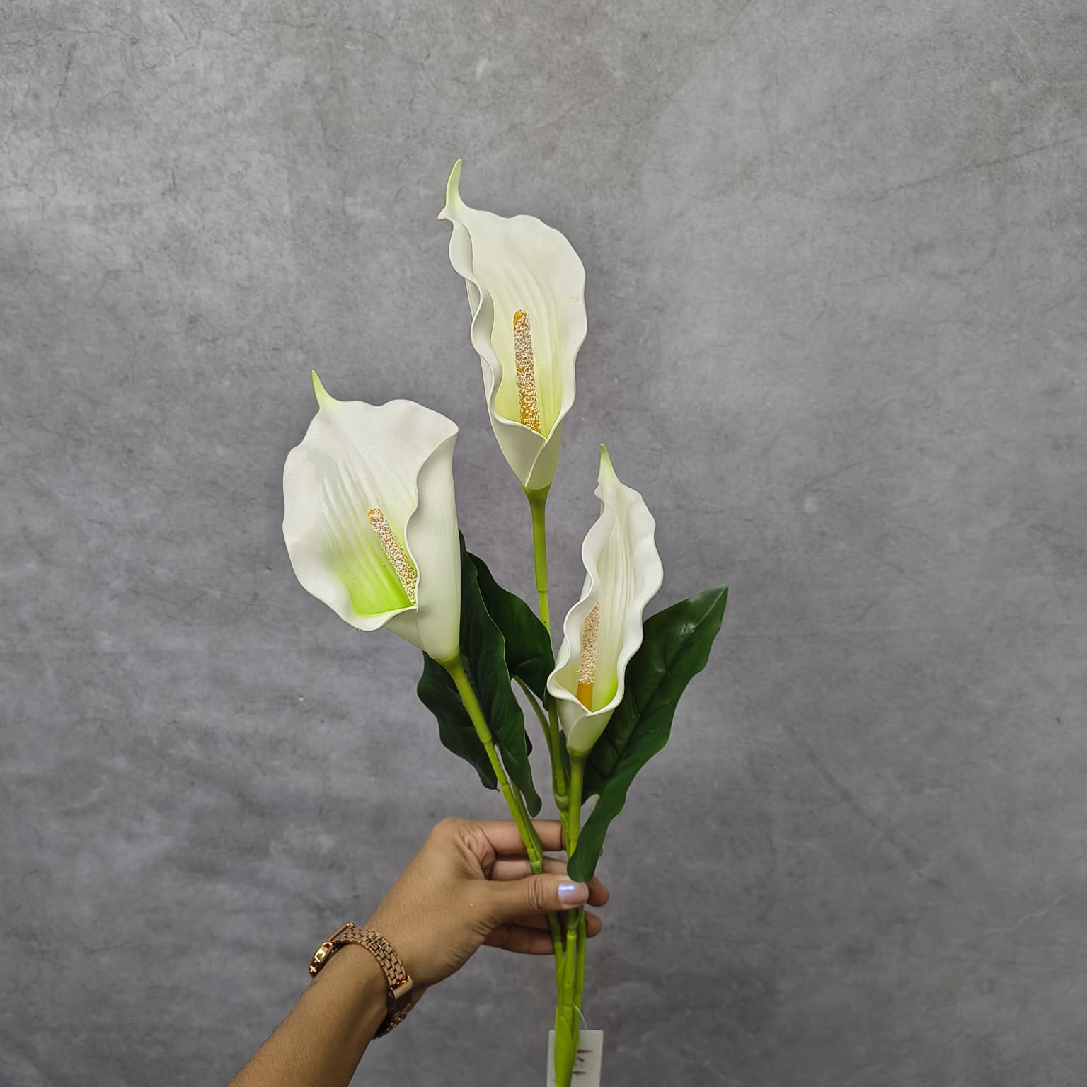 Esta haste de copo de leite artificial contém três galhos e mede 94 cm de altura. Produzida em EVA de alta qualidade, as flores apresentam uma textura suave e realista, com pétalas brancas que envolvem um delicado pistilo amarelo no centro. As folhas verdes grandes e detalhadas, também em EVA, complementam a naturalidade do arranjo. Este item é ideal para compor ambientes elegantes e sofisticados, com a durabilidade e a praticidade das flores artificiais.