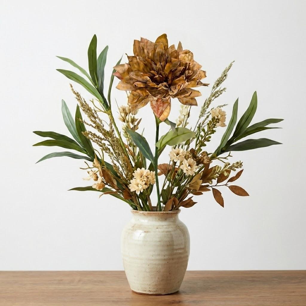 O Galho DáliA Outonada 65cm Marrom é perfeito para composições sofisticadas com paleta terrosa e aconchegante. Com uma flor cheia, volumosa e com efeito outonado (mescla de tons amarronzados), ele traz textura e personalidade para arranjos em vasos, aparadores, mesas e decorações sazonais.