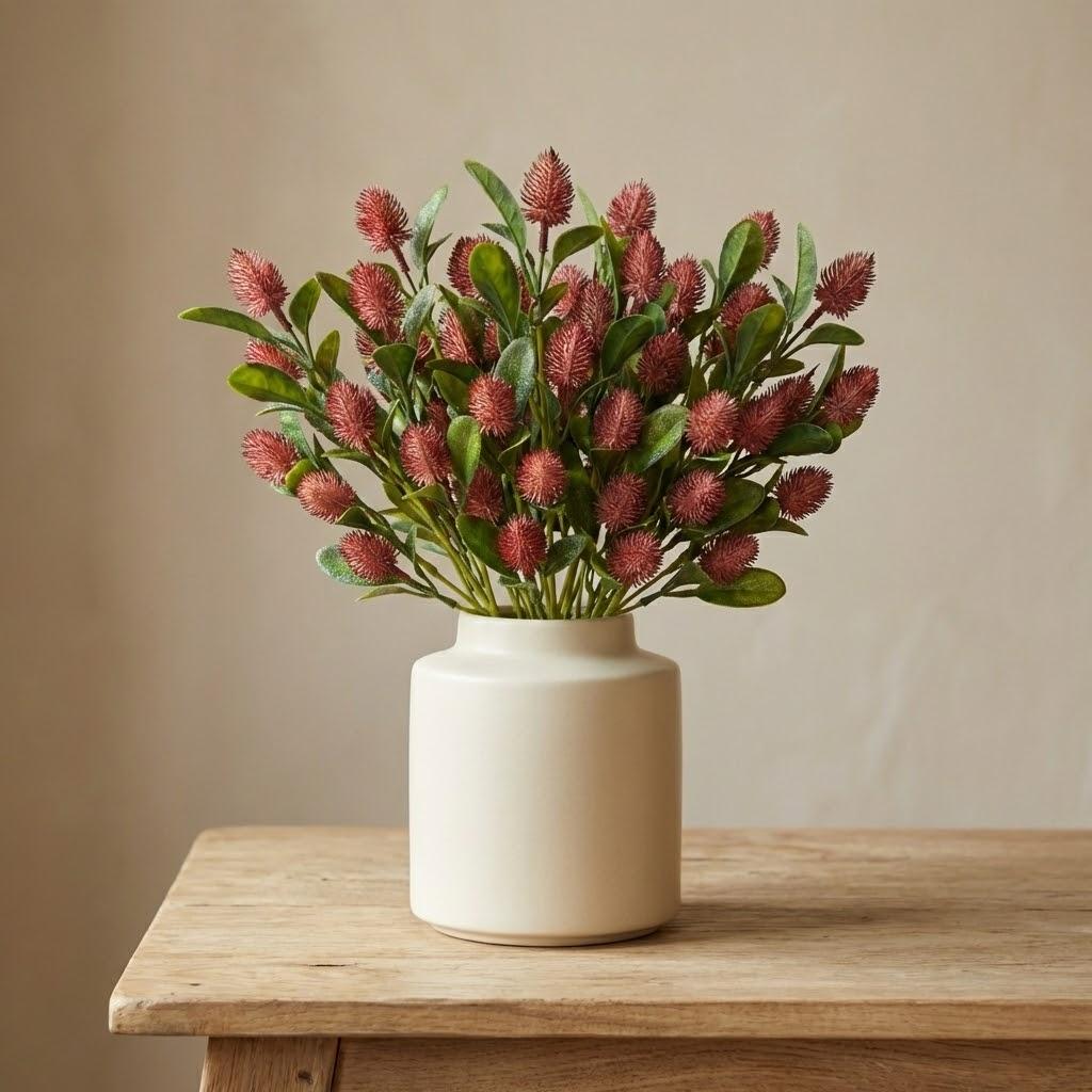 Com 48cm de altura, funciona muito bem em vasos pequenos e médios, e também como folhagem de preenchimento em arranjos maiores. O vermelho combina com paletas terrosas, verde, branco, dourado e também é uma ótima escolha para composições sazonais (outono/inverno e Natal). Por ser artificial, oferece praticidade: não murcha, não precisa de água e mantém a beleza por muito mais tempo.