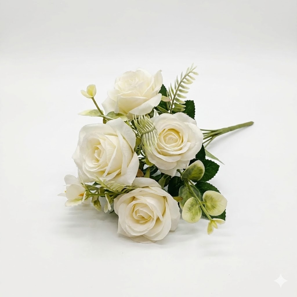 Com aproximadamente 30cm de altura e 5 rosas bem formadas, ele tem pétalas em tom branco suave, folhagens verdes e raminhos decorativos que deixam o arranjo harmonioso e cheio de charme.