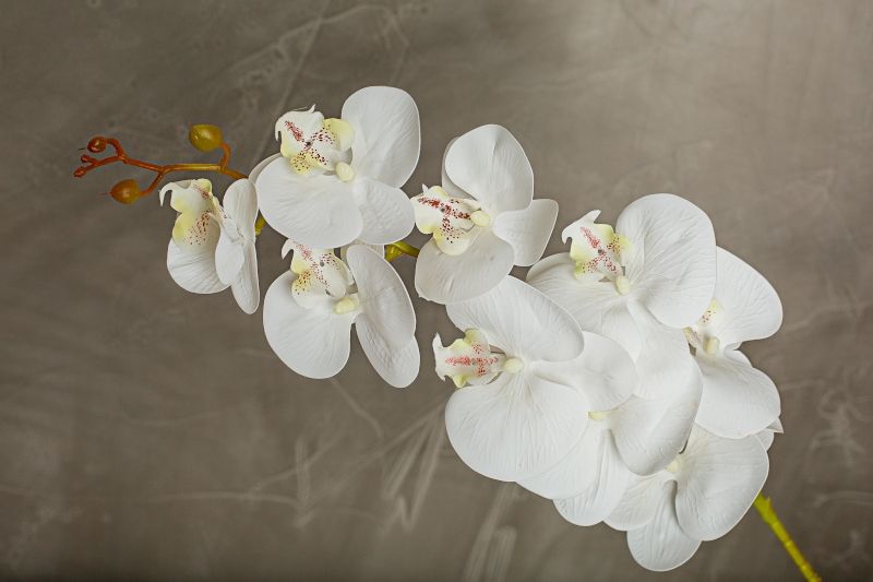 Medidas: 110 cm (haste+flores). Material: silicone, plástico e ferro. Contém 9 botões de orquídea.